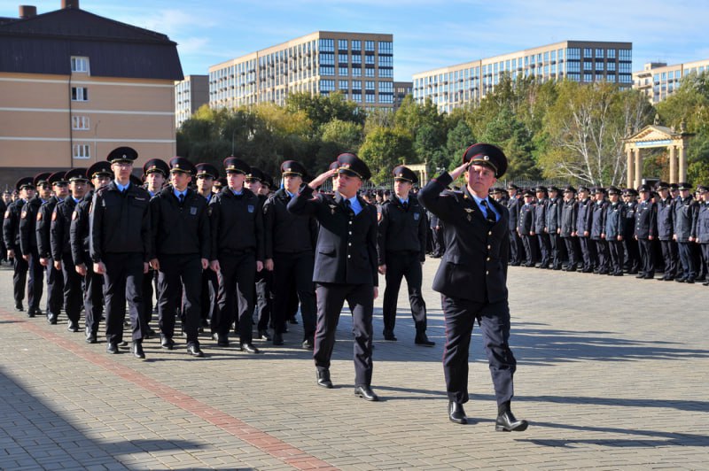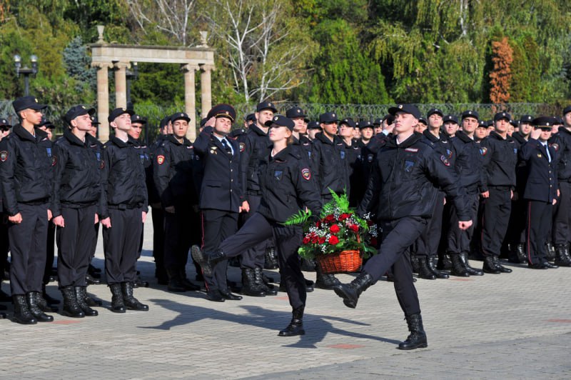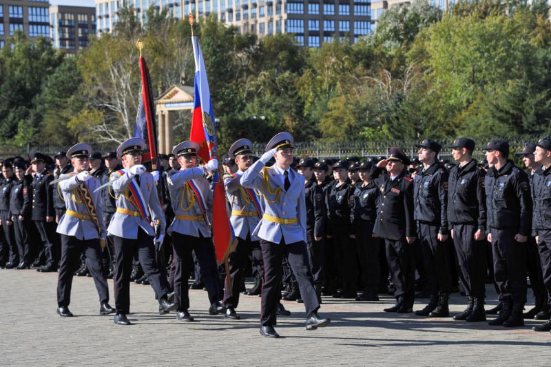 Почетное право возложить цветы к памятнику сотрудникам органов внутренних дел, погибшим при исполнении служебного долга, было предоставлено курсантам 1 курса Артему Измайлову и Анастасии Слюсаревой. Участники мероприятия почтили память погибших минутой молчания. В завершение личный состав университета прошёл по строевому плацу торжественным маршем.