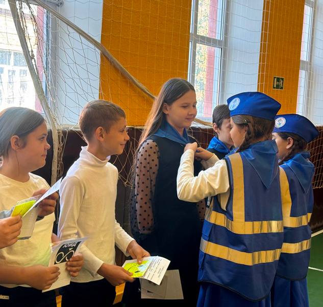 В качестве знакового подарка детям вручили светоотражающие значки, чтобы быть заметным на дороге в темное время суток и в условиях пасмурной погоды.