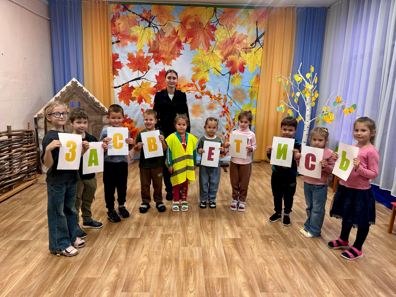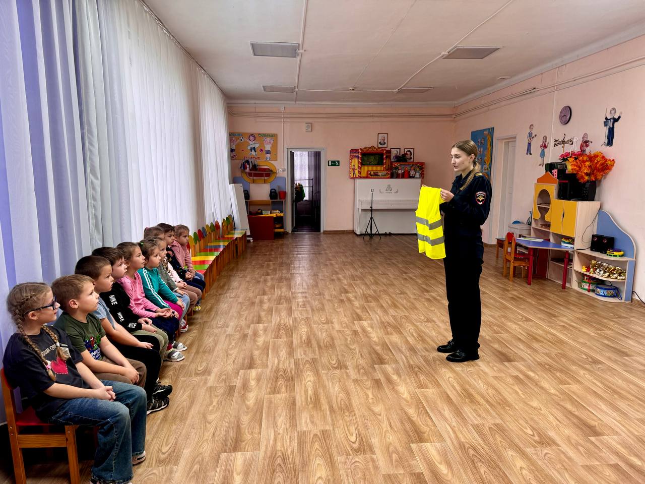 Инспекторы организовали познавательную беседу в игровой форме, в ходе которой объяснили ребятам, что такое световозвращающие жилеты и почему их ношение особенно важно в темное или пасмурное время.