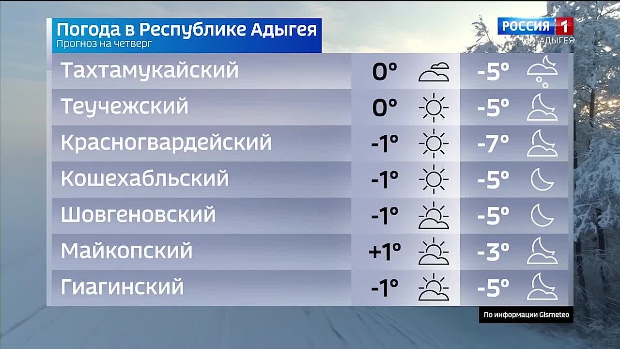Доброе утро!25 декабря в Адыгее ожидается облачная погода.Ветер: до 7 м/с.Майкоп | Мыекъуапэ 0Адыгейск | Адыгэкъалэ -1Гиагинский район | Джэджэ район -1Кошехабльский район | Кощхьэблэ район...