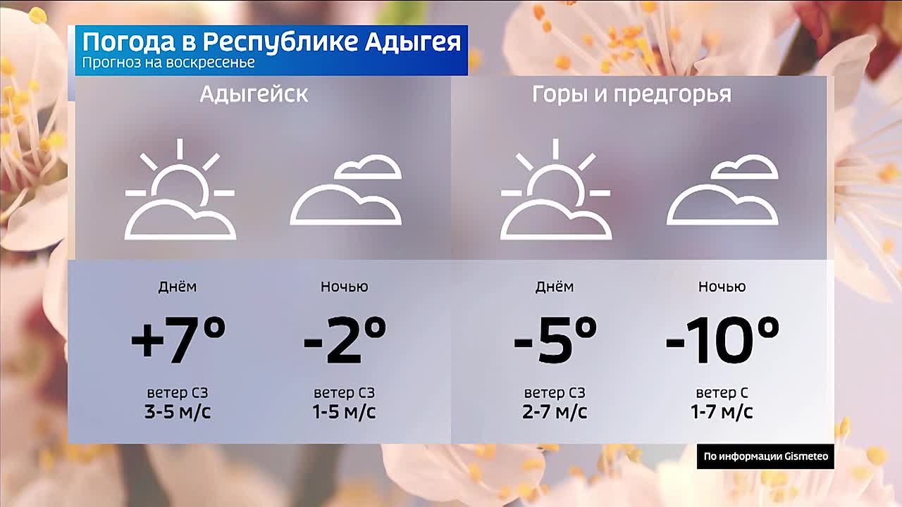 Доброе утро!8 марта в Адыгее переменная облачность.Порывы ветра: до 8 м/с.Майкоп | Мыекъуапэ +5Адыгейск | Адыгэкъалэ +5Гиагинский район | Джэджэ район +4Кошехабльский район | Кощхьэблэ район +5Шовгеновский район | Шэуджэн район +4Красногвардейский...