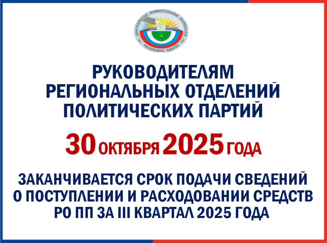 С 1 по 30 октября 2025 года включительно региональные отделения политических партий должны подать в ЦИК Адыгеи сведения о поступлении и расходовании средств за III квартал 2025 года в соответствии с пунктом 3 статьи 34 Федерального закона от 11 июля 2001 года № 95-ФЗ «О политических партиях».
