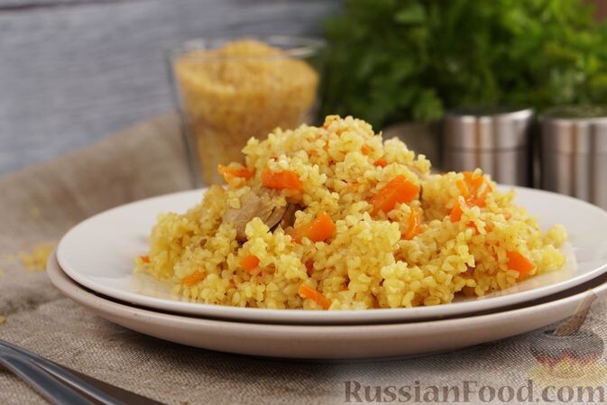 - Булгур с курицей. Это блюдо удивляет своим насыщенным вкусом, согласующимся с ароматом специй и овощей. Простое в приготовлении, но при этом способное оставить впечатление на всех ваших близких.