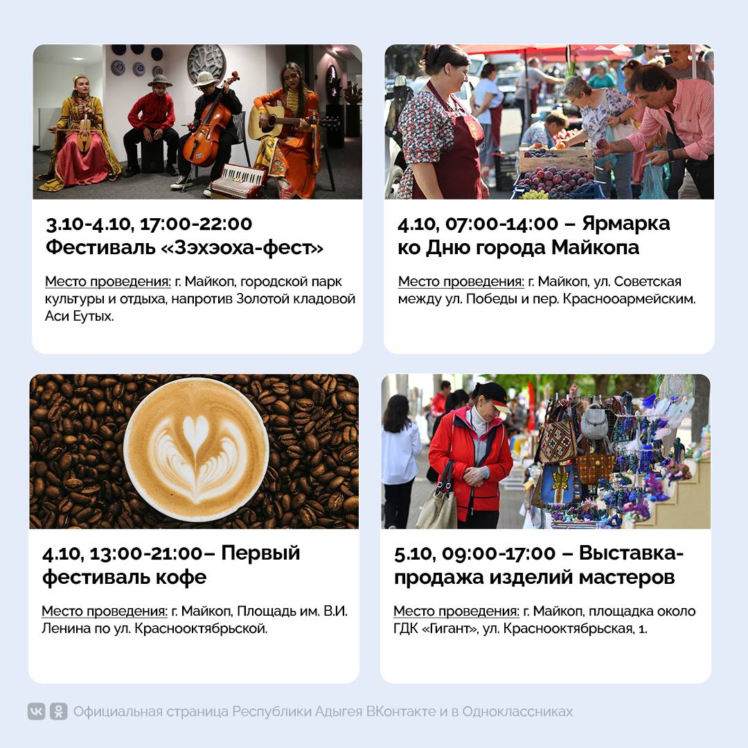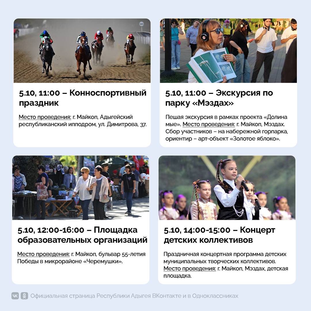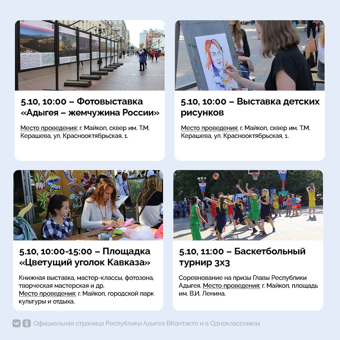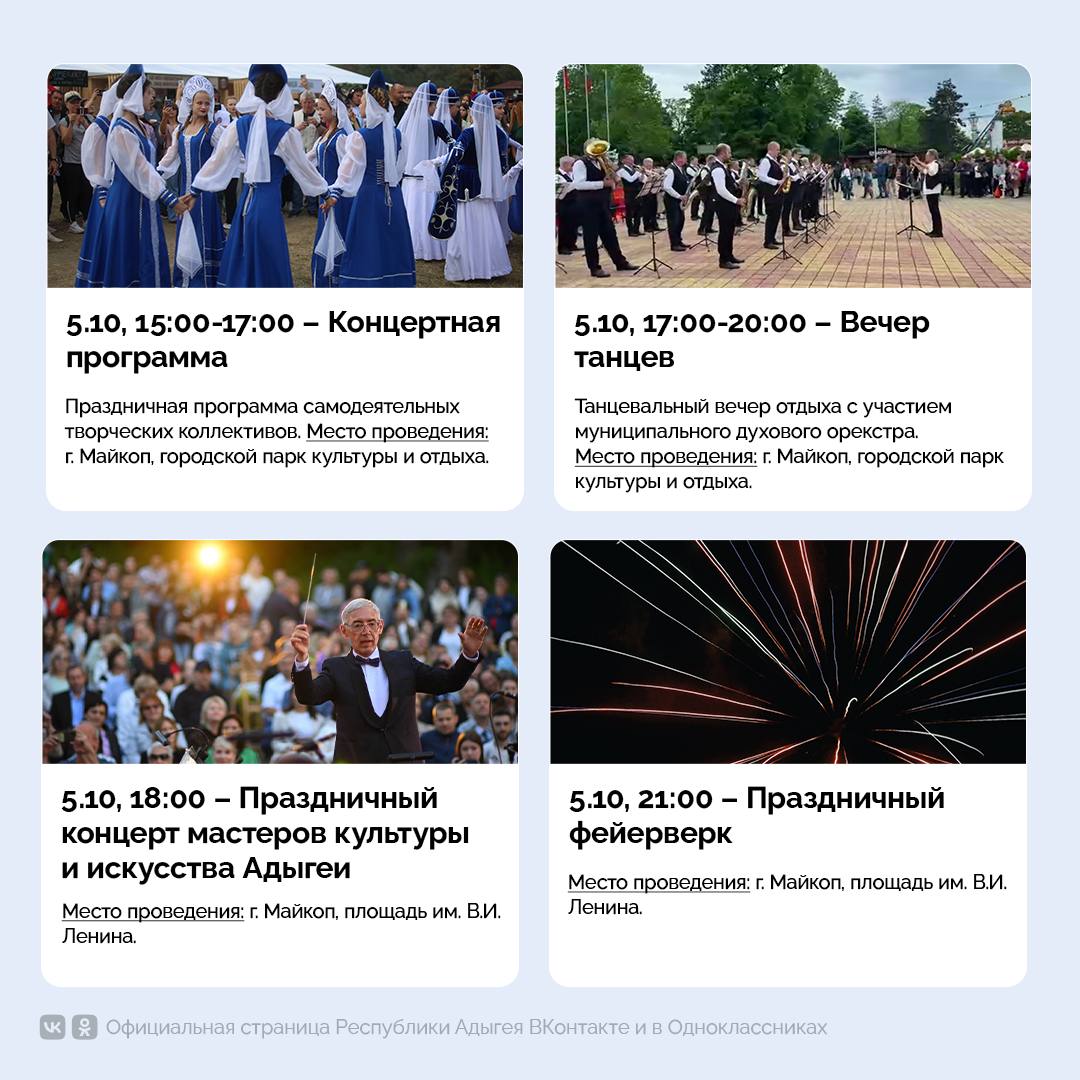 Масштабный концерт с участием ведущих артистов Адыгеи состоится в Майкопе. Мероприятие запланировано на 18:00 5 октября и пройдёт на площади им. В.И. Ленина. В программе – выступления именитых исполнителей республики, а также государственных и муниципальных творческих коллективов. Завершится концерт ярким фейерверком в 21:00.