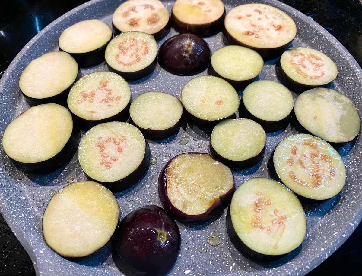 - Разогрейте сковороду с растительным маслом и обжарьте баклажаны до золотистой корочки. Обратите внимание, что этот овощ склонен впитывать много масла, поэтому по окончании жарки рекомендуется выложить их на бумажное полотенце, чтобы избавиться от лишнего жира.