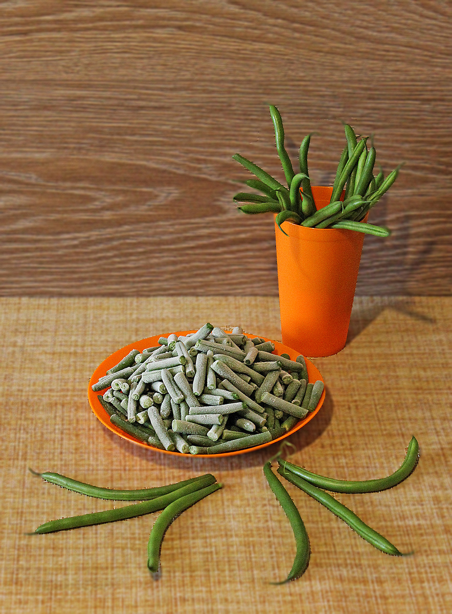 Затем необходимо отрезать кончики стручков и нарезать их на кусочки длиной 3–5 см. Подготовленные отрезки можно выложить в пакет, стараясь распределить их в один слой для более равномерного замораживания. После того как фасоль заморозится, пакеты можно сложить более компактно.
