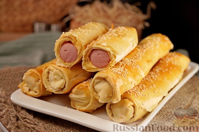 Сосиски завернуты в нежное тесто фило и обжарены до золотистой корочки. К ним добавляется тертый сыр, а сверху посыпается кунжут, что придаёт блюду дополнительный вкус и хруст.