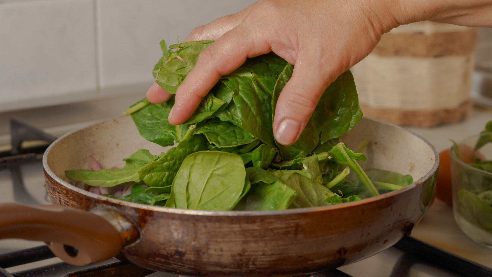 Первым делом надо промыть шпинат в холодной воде. После этого выложите его на предварительно разогретую сковородку. Подождите, пока он немного уменьшится в объеме. После этого залейте сливки так, чтобы они закрыли дно сковородки.