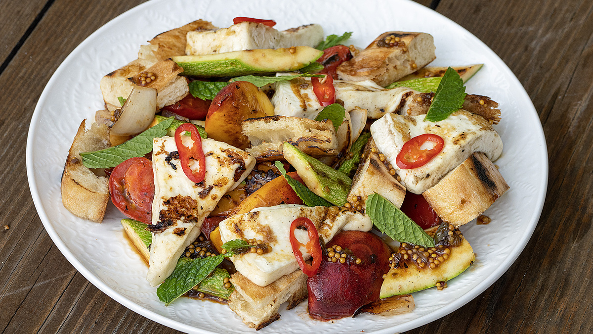 Для соуса нужно смешать соевый соус, столовую ложку растительного масла, горчицу, мед, мелко нарезанный халапеньо и сок лайма. Все тщательно перемешивается, и можно приступать к грилю. Овощи с персиком выкладываются на гриль и жарятся до появления золотистой корочки. Хлеб также обжаривается до хрустящего состояния.