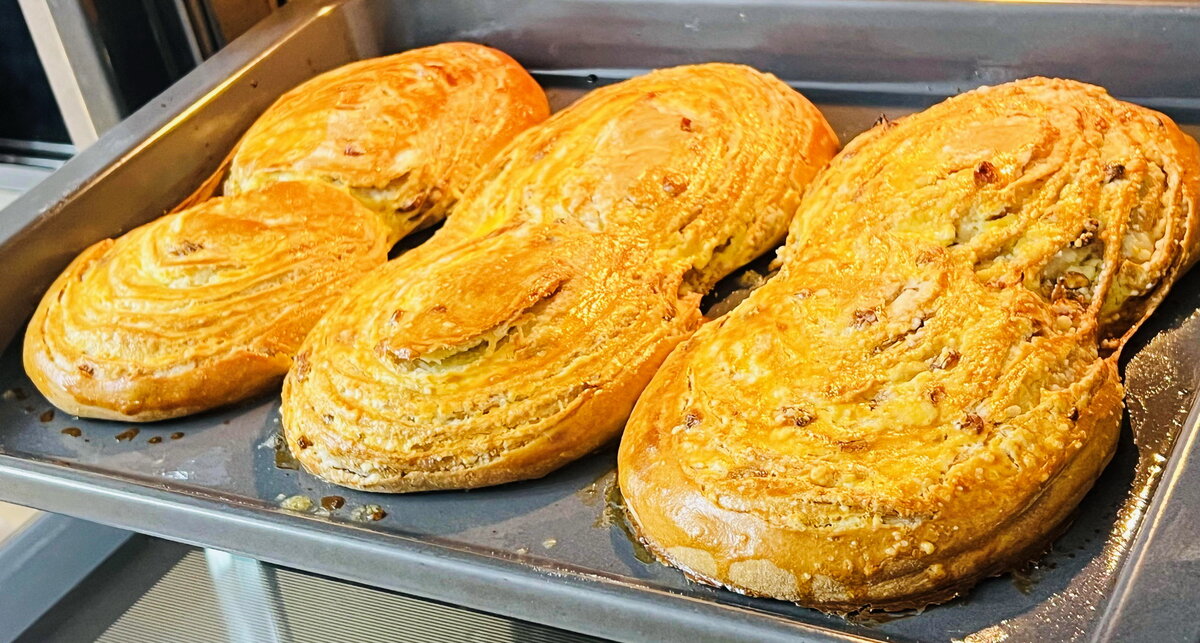 Разделите тесто на три равные части и скатайте их в колобки. Затем раскатайте каждый колобок в тонкий пласт, выкладывая начинку по центру. Сложите тесто, как показано в видео-рецепте, и аккуратно заверните в рулет. Сделайте надрез в центре, чтобы сформировать привлекательную форму, и немного раскатайте заготовку.