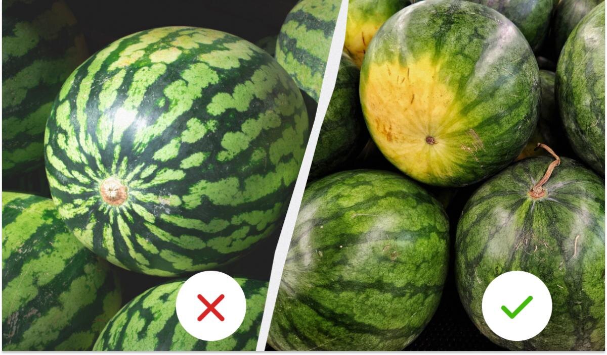 Обратите внимание на наличие земляного пятна — оно должно быть желтого или оранжевого цвета. Это свидетельствует о том, что арбуз созревал самостоятельно, без применения добавок. Плоды с бледными или зелеными пятнами лучше не брать.