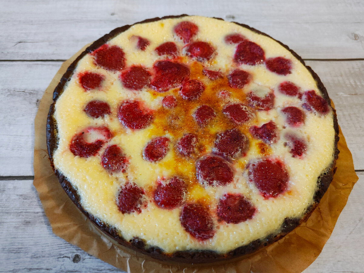 Далее следует достать форму с основой из холодильника, вылить на неё приготовленную заливку и равномерно распределить клубнику по поверхности. Важно убедиться, что тесто выровнено до уровня заливки.