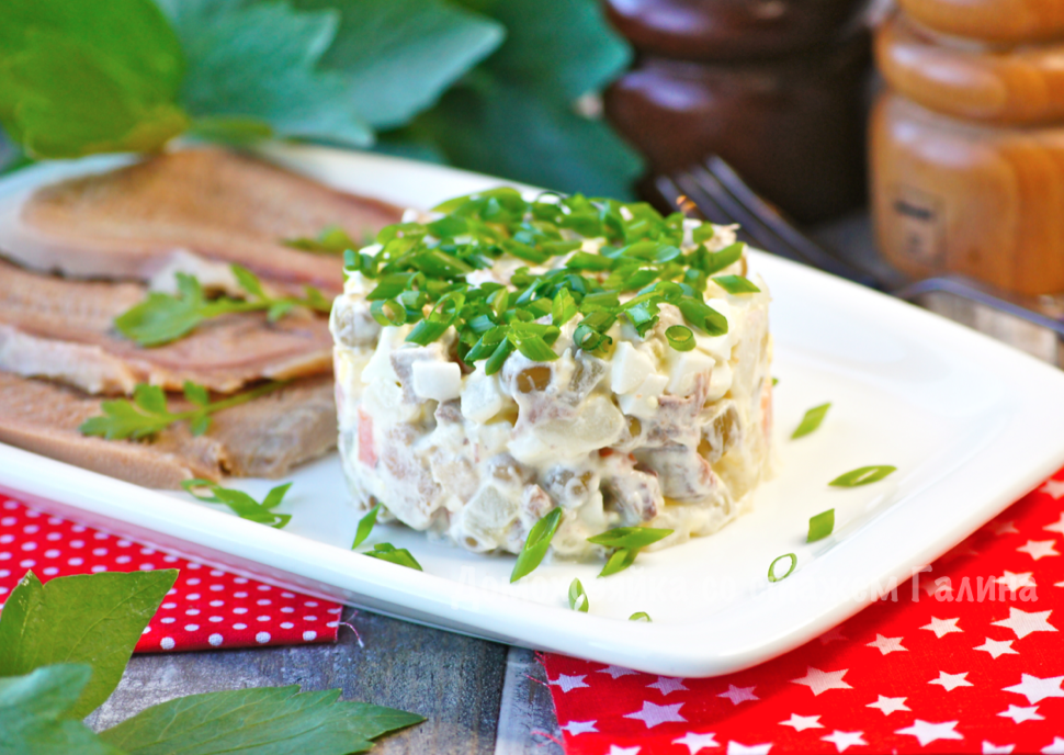 Теперь салат готов! Оливье с языком пора ставить на стол, и он несомненно станет звездой любого праздничного угощения.