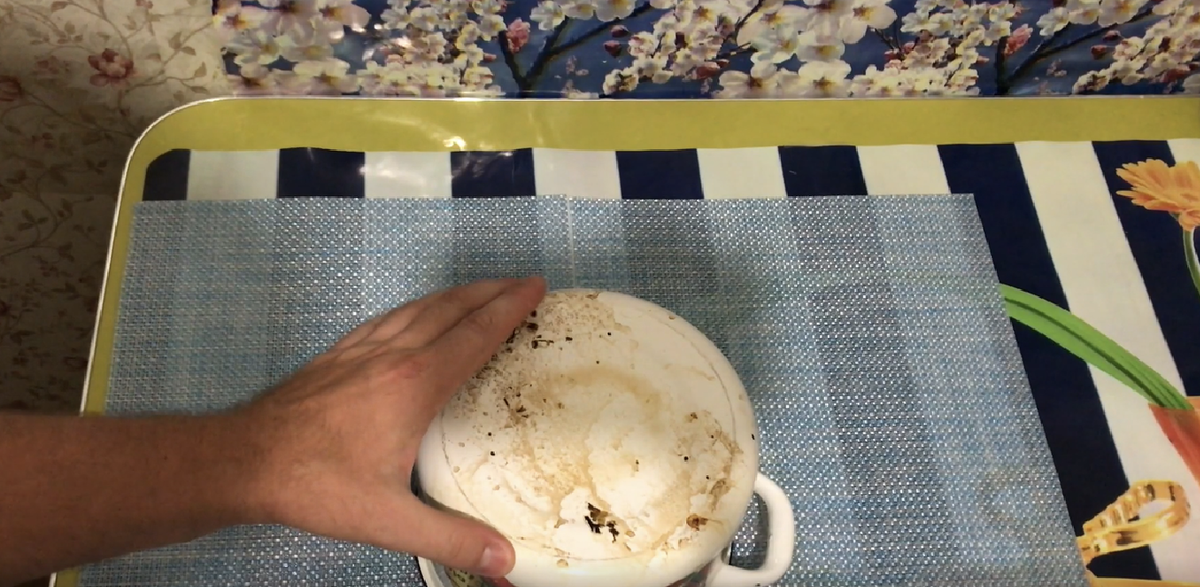 По прошествии времени можно убедиться, как загрязнения стали намного легче выводиться, зачастую даже достаточно легкого касания лопаткой. После этого, кастрюлю следует промыть под струей холодной воды, чтобы удалить остатки средства.