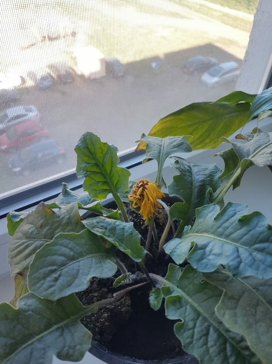 Прошло время, и гербера начала чернеть. В ожидании новых листьев, её хозяин заметил, что растение выглядит всё хуже. В созданной жаре заботу о нём прервали, и при возвращении всё выглядело печально. Полив не помог, и только экстренная пересадка могла спасти ситуацию.