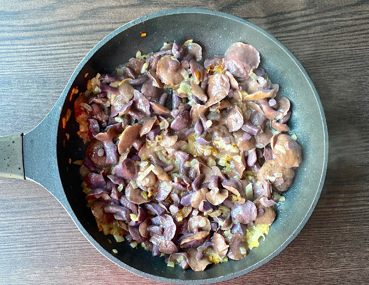 Для начала грибочки были разморожены и нарезан лук, который обжаривался на сливочном масле до красивой золотистой корочки. Затем к лукам добавились козлята, которые придавали блюду необычный оттенок. Они аккуратно обжаривались до появления легкого румянца и посолились по вкусу.