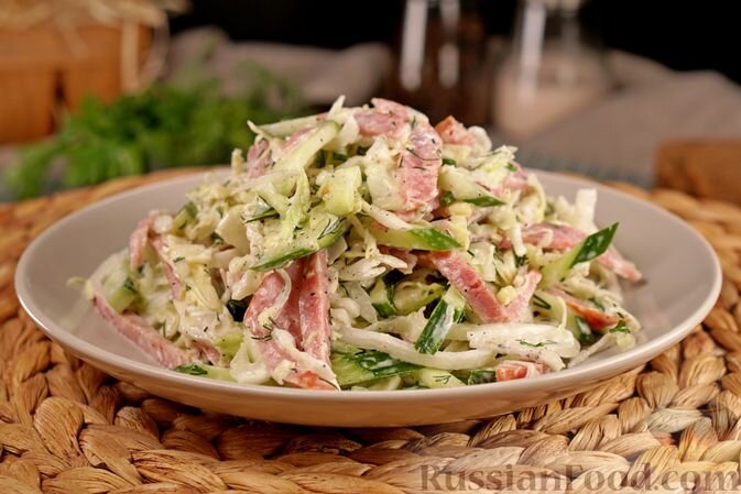 Салат из капусты с огурцами и колбасой – идеальный вариант для легкого обеда. Этот салат является не только быстрым в приготовлении, но и сочетает в себе насыщенный вкус копченой колбасы и свежесть овощей.