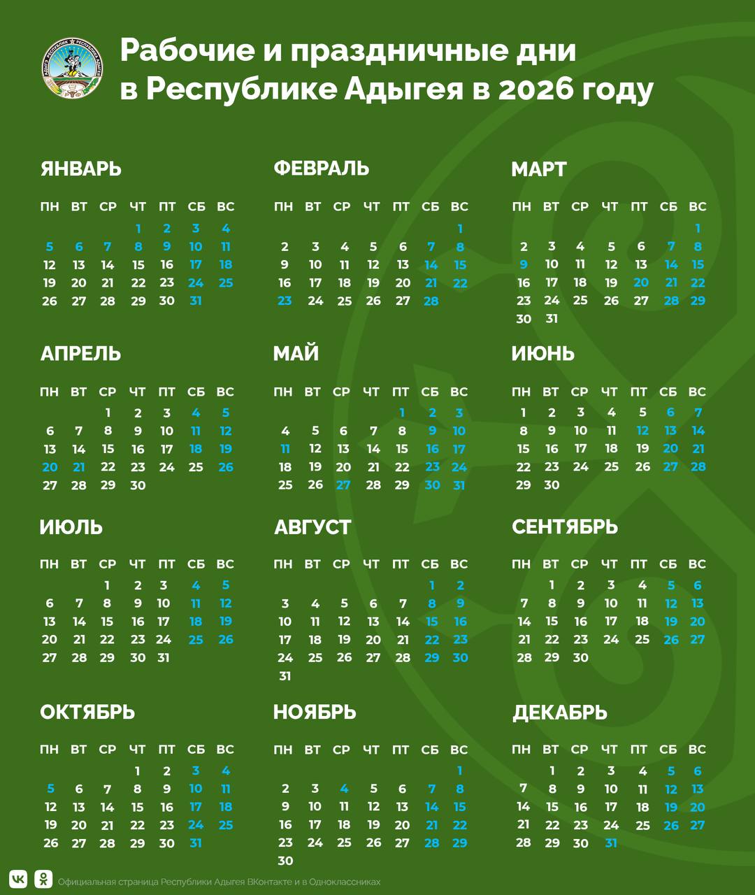 Для удобства публикуем календарь рабочих и праздничных дней в Республике Адыгея в 2026 году.