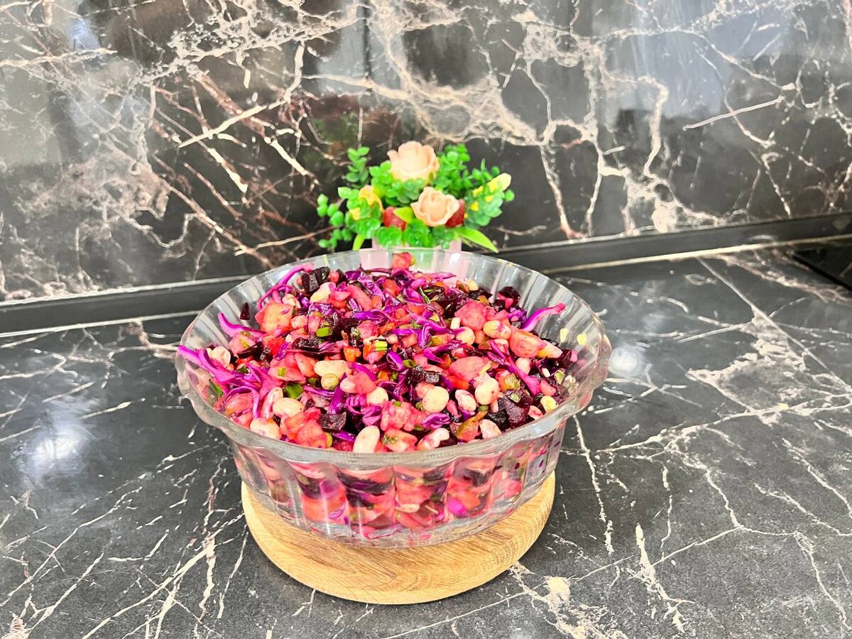 Нежный винегрет с краснокочанной капустой станет изюминкой вашего стола, радуя глаз яркими цветами и балансом вкусов. Приятного аппетита!