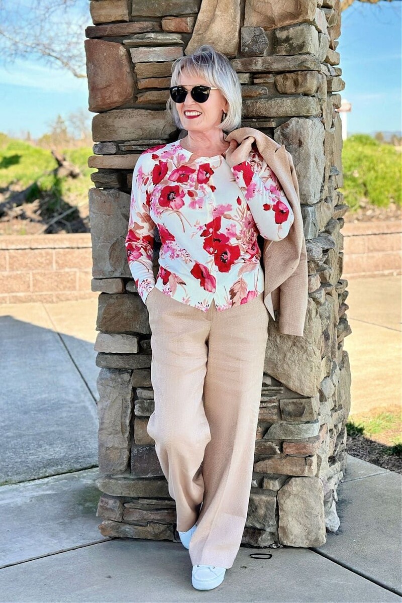 - Бежевый костюм с изюминкой: Основа современного образа – элегантный свободный бежевый костюм. Как основу можно использовать прямые брюки и приталенный жакет. Дополните его блузкой с принтом: например, яркие красные маки на светлом фоне будут выглядеть потрясающе. Завершите образ белыми кроссовками и стильными темными очками.