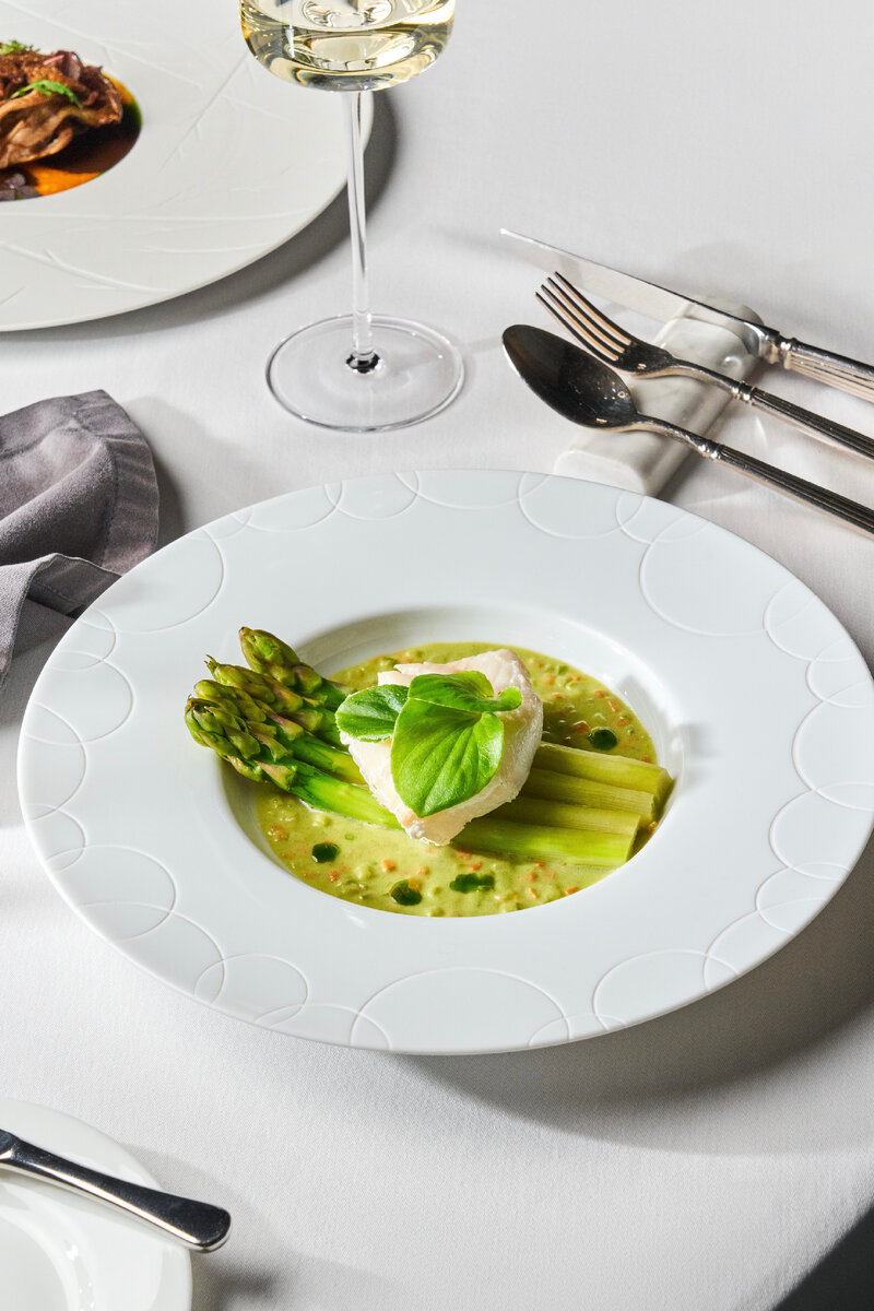 Филе клыкача готовится на пару: его следует слегка посолить и готовить в пароварке или мультиварке около восьми минут. В то время как рыба готовится, свежую спаржу нужно отварить до мягкости в подсоленной воде.