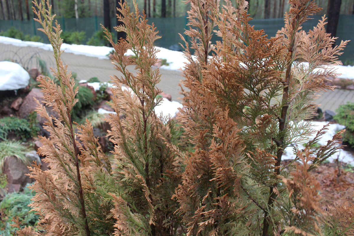 1. Изменение цвета хвои. Хвоя, которую постигает весеннее иссушение, приобретает различные оттенки коричневого, переходя от ржавого до бежевого. Это может указывать на то, что часть растения уже повредилась.