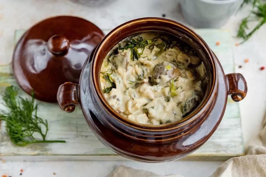 Полученную смесь можно выкладывать в горшочки. Сверху следует присыпать нарезанной зеленью и закрыть крышками. Далее горшочки с грибами ставят в холодную духовку, включив ее на 180 градусов. Через 15 минут можно смело подавать это ароматное и сытное блюдо на стол.