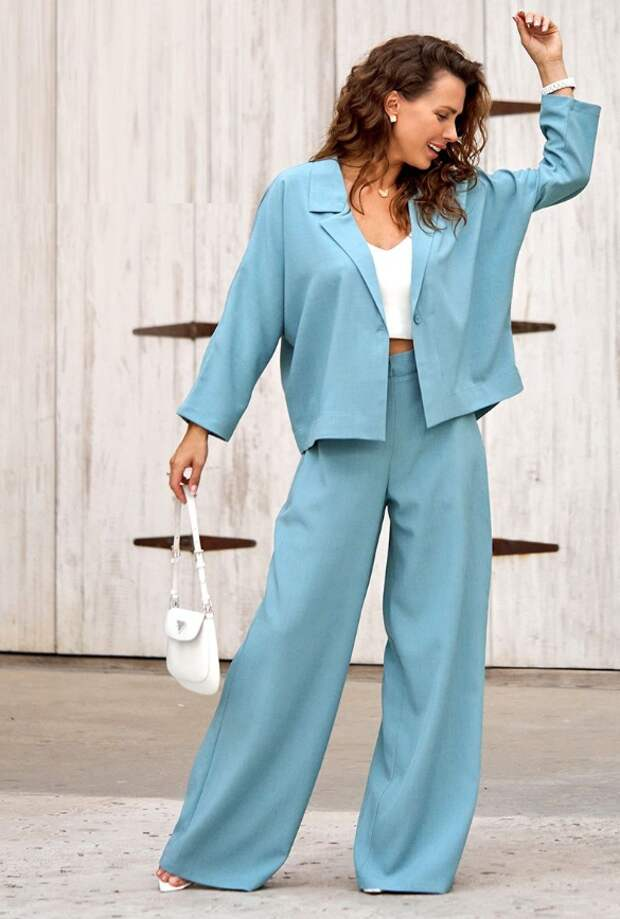 - Брючный костюм: Стильный брючный костюм — это не только удобно, но и крайне стильно. Костюм светлого оттенка с жакетом свободного кроя и белым топом создаст впечатление благородства и строгости одновременно. Удобные босоножки завершат образ.