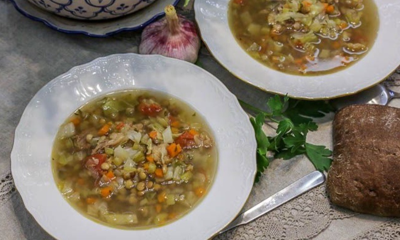 После этого в кастрюлю добавляется ранее приготовленный бульон, и следует довести смесь до кипения. Затем добавляется мясо, чечевица и все это варится на среднем огне до готовности чечевицы, что занимает примерно 20-30 минут.