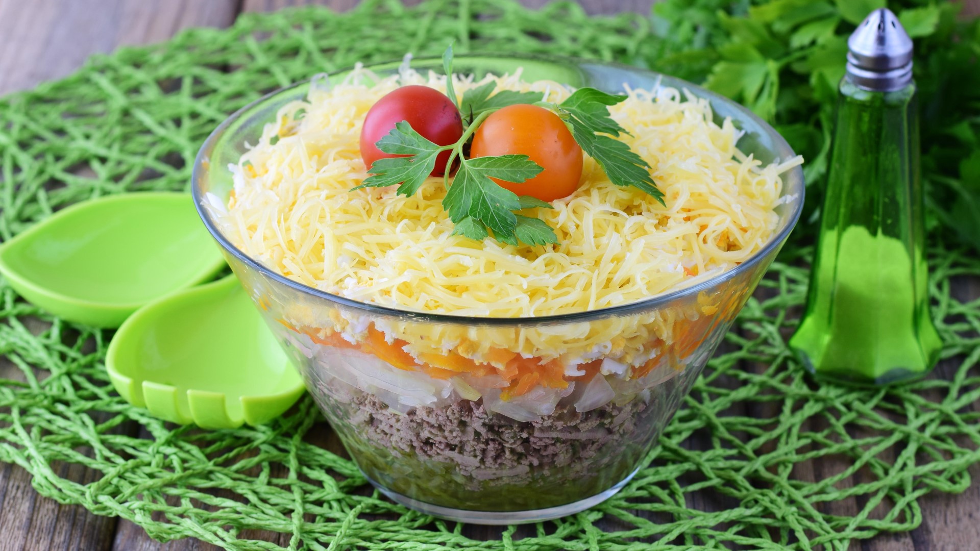 Выложите ингредиенты слоями, промазывая каждый небольшим количеством майонеза. Порядок должен быть следующим: грибы с луком, мясо, яйца и тертый сыр, делится портал Food.ru. Приятного аппетита!