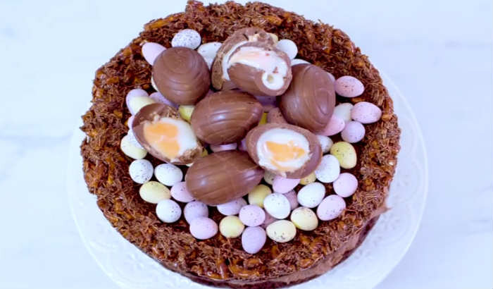 После выпечки дать коржам немного остыть, а затем подготовить верхний гнездовой корж. Для этого в микроволновке растопить зефир и масло. Затем добавить какао и перемешать до однородной консистенции. В завершение поместить массу в формы, создавая форму гнезда, и дать застыть.