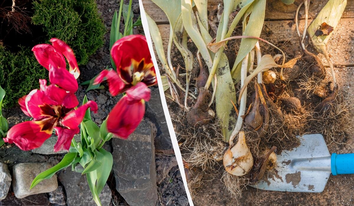 Луковицы тюльпанов не всегда нужно выкапывать. Во многих случаях они нормально растут в земле на протяжении нескольких лет. Однако в случае сортовых тюльпанов и если планируется пересадка, этот процесс становится необходимым. Луковицы лучше всего выкапывать в конце июня — середине июля, когда две трети листьев уже пожелтели.