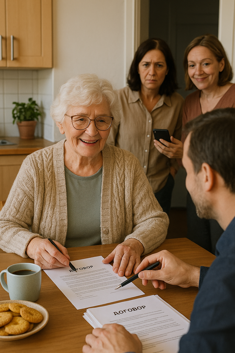 1. Первая линия: «добрая бабушка». Она ведёт себя вежливо и растерянно, может даже угостить чаем, пока за кулисами действуют подделки — «родственники» и подставные лица, готовые подтвердить «сниженную дееспособность».