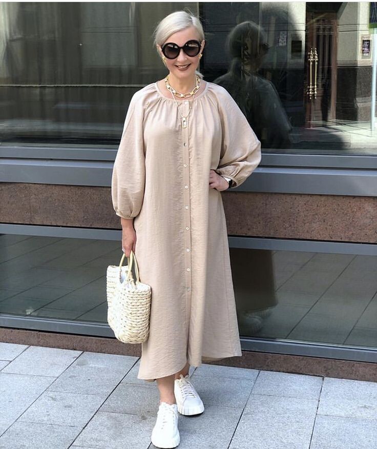 - Льняное платье-рубашка: романтическое бежевое платье с пышными рукавами и широким подолом станет идеальным вариантом для жаркого дня. Оно будет прекрасно смотреться в сочетании с белыми кроссовками, подчеркивая современный стиль.
