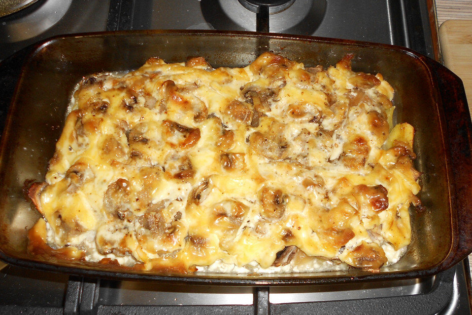 Лук тщательно промыть и очистить, затем нарезать перьями и обжарить на сковороде до появления золотистой корочки.Щедро приправив водой, продолжать жарить, позволяя лукам распариться и карамелизоваться до красивого коричневого цвета.Очистить картофель и нарезать его на кружочки, толщиной около 0,5 см. Если клубни крупные, половинки тоже подойдут.Форму для запекания смазать подсолнечным маслом и уложить картофель единственным слоем. Посыпать обильно смесью специй из кориандра, соли и перца.Лук, который уже успел поджариться, равномерно распределить по картофельному слою, а сверху уложить фарш со специями.Крупно нарезанные шампиньоны поместить на мясо, посыпать смесью специй, после чего все щедро смазать майонезом.Перед отправкой в духовку, в форму налить немного воды, чтобы запеканка не пересохла. Запекать при температуре 200°C в течение 30-45 минут до золотистой корочки.Эта картофельная запеканка со свининой не только порадует вас своим вкусом, но и станет отличным вариантом для разнообразия в рационе. Идеальное блюдо для совместных семейных ужинов!