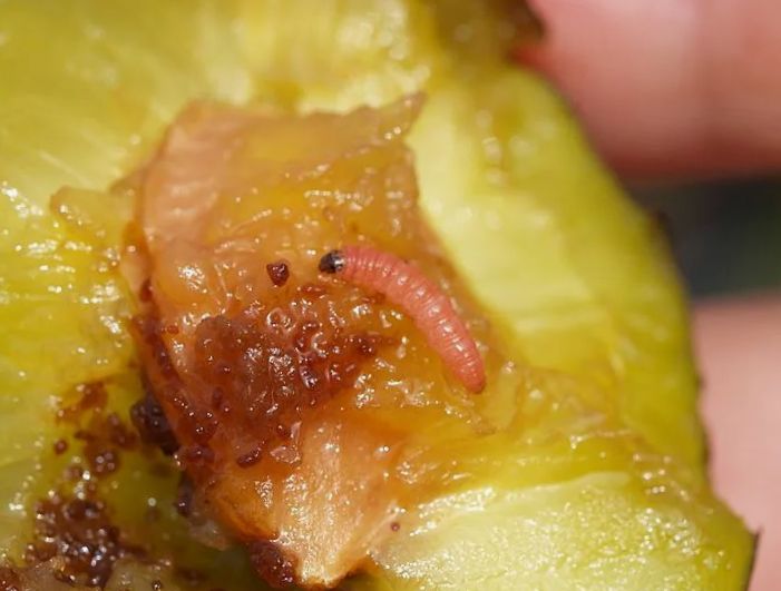 - Темные точки — следы гусениц, которые внедряются в плоды