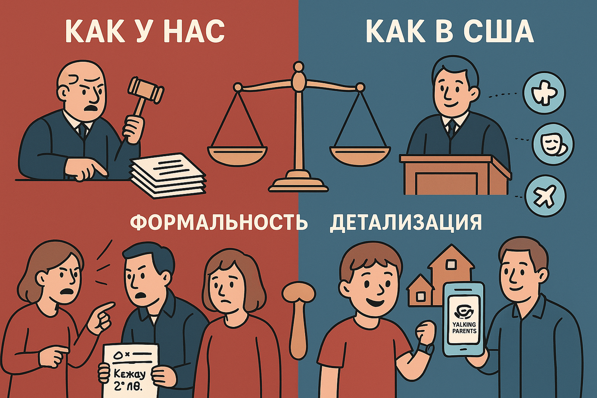 На судебных процессах, как в России, так и в США, можно наблюдать разные подходы к определению условий общения. В частности, рассмотрим ситуацию с делами, связанными с детьми, в штате Флорида, где используются четкие и детализированные схемы, которые обговариваются и утверждаются судом.