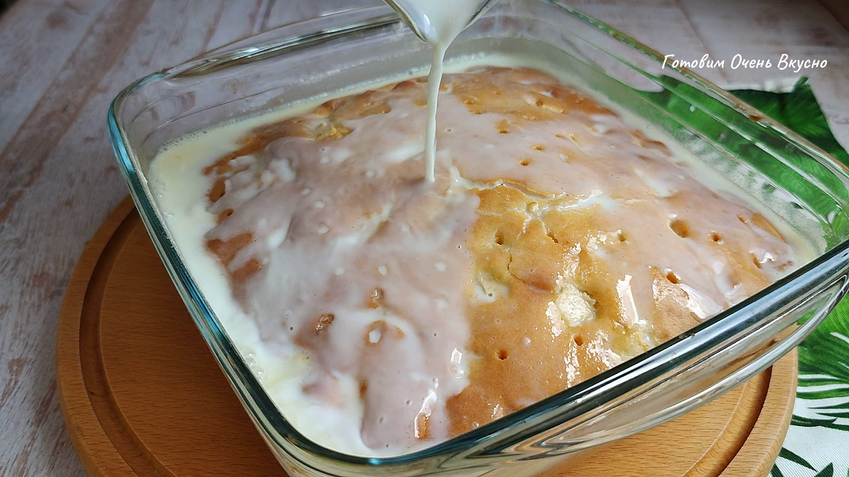 Шаг 5: За 5 минут до готовности к горячему молоку добавляются сахар и масло, которые тщательно смешиваются. По завершении выпекания пирог достается из духовки, в нем делаются отверстия, и он заливается молочной пропиткой, после чего оставляется на 10 минут.