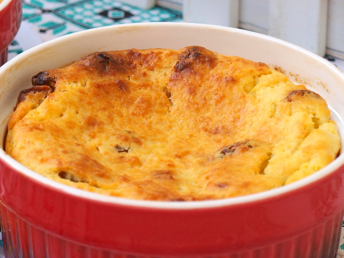 Следующим шагом просеивают 3 столовые ложки муки и немного разрыхлителя. Смешивание должно быть аккуратным, чтобы сохранить воздушность. А чтобы добавить нотки сладости, в массу добавляют 2 столовые ложки предварительно подготовленного изюма. Его стоит замочить в горячей воде на несколько минут и после обсушить.