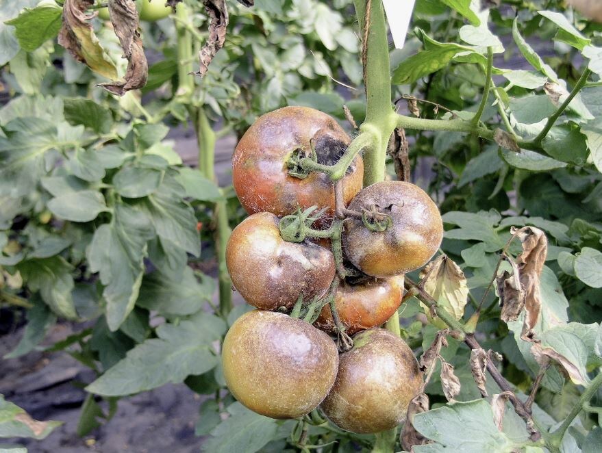 - Плоды: Твёрдые коричневые пятна, которые постепенно захватывают весь томат.