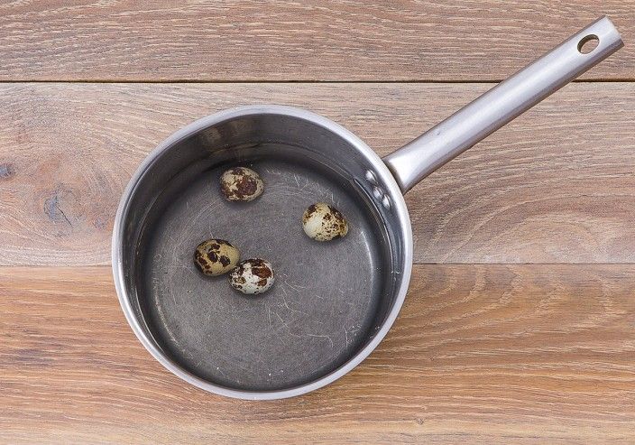 Подготовка перепелиных яиц: Положите яйца в кастрюлю с холодной подсоленной водой. Доведите до кипения и варите на среднем огне 6 минут.