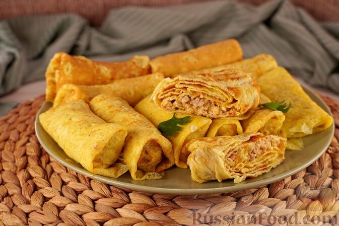 - Яичные блинчики с фаршем и сыром — нежные блинчики, фаршированные мясным фаршем и плавленым сыром, идеально подходят как для завтрака, так и для ужина.