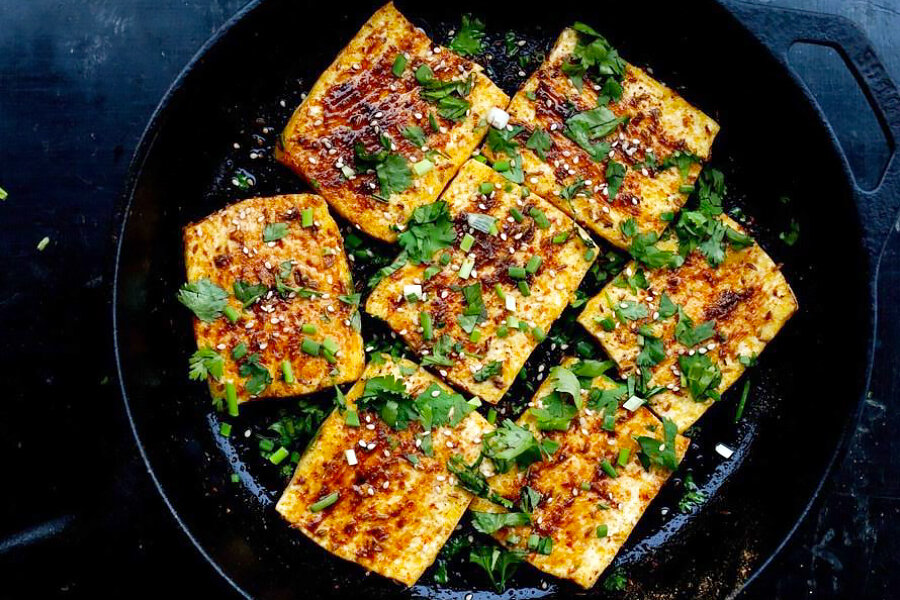 - На сковороде разогрейте растительное масло до высоких температур и аккуратно выложите кусочки тофу. Равномерно посыпьте половиной смеси специй, обжаривайте до золотистой корочки в течение 3-5 минут, затем переверните.