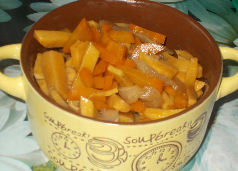 Для начала, овощи нужно нарезать на тонкие полоски и уложить в форму для запекания. Важно разместить морковь на дне, а сверху добавить нарезанную репу. Затем стоит обильно полить все это медом и добавить пару ложек воды, что предотвратит пригорание.