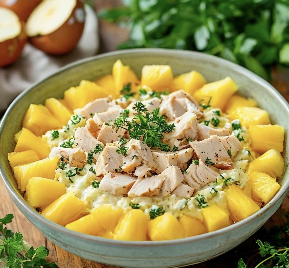 Этот легкий и освежающий салат станет отличной находкой для праздничного стола. Он сочетает в себе нежное мясо курицы и сладость ананасов, что придаст блюду особый шарм.
