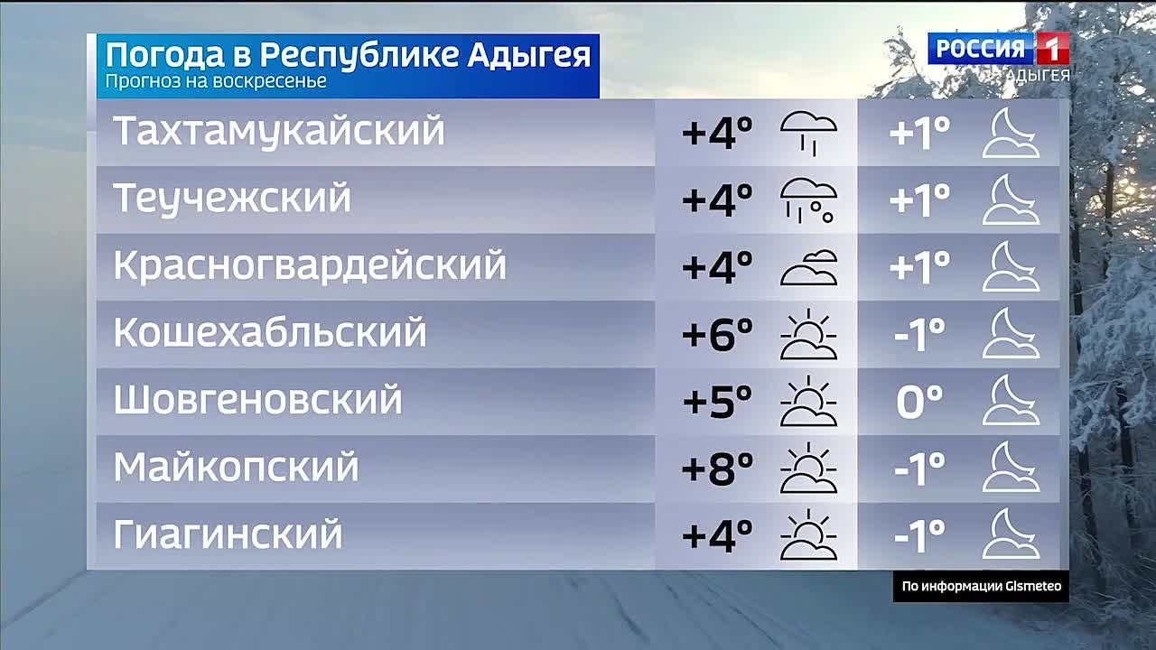 Температура воздуха в равнинной части +1… +5 °C. Ветер 2-3 м/с.В горах:Лагонаки -4… +2 °Cг. Оштен -4… -7 °CЕлена Юсеф/Советская АдыгеяПодписаться на МАХ