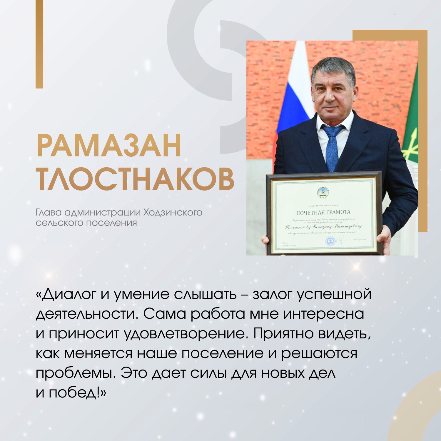 С октября 2012 года Рамазан Тлостнаков возглавляет Ходзинское сельское поселение. За это время он успешно решил множество вопросов, касающихся социально-экономического развития и организации жизни в ауле.