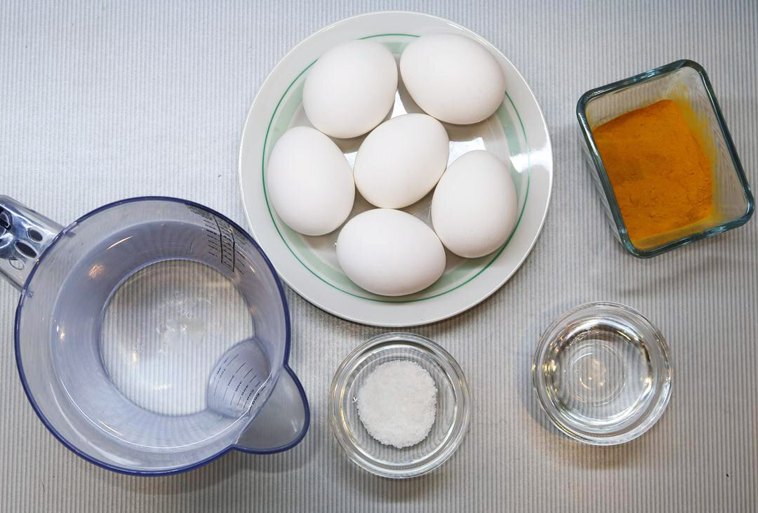 В глубокой посуде соедините воду, соль, уксус и куркуму, тщательно перемешайте. Опустите яйца в полученный раствор.