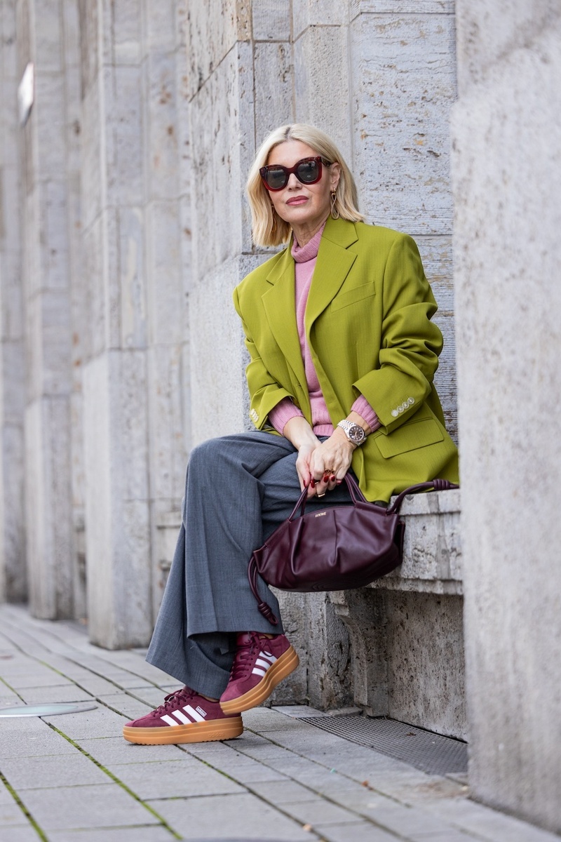 Яркие ансамбли, такие как брюки фисташкового цвета с нарядной блузкой и белыми кроссовками, а также шикарные сочетания бежевых и бордовых оттенков, создают эффектный и стильный вид для женщин 50+. Петра вдохновляет своих поклонниц на то, что мода не имеет пределов, и в любом возрасте можно выглядеть потрясающе!