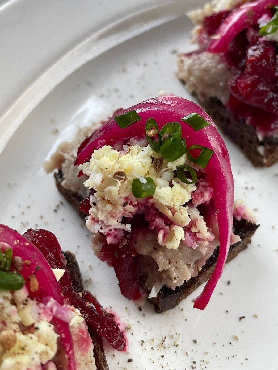 Далее приступают к приготовлению форшмака. Хлеб замачивают в молоке, а затем в блендер закладывают сельдь, лук, хлеб и масло. Всё тщательно измельчают до однородной консистенции. Готовую массу оформляют на хлебе с добавлением чатни, тертым яйцом и щепоткой кориандра, создавая неповторимое сочетание.